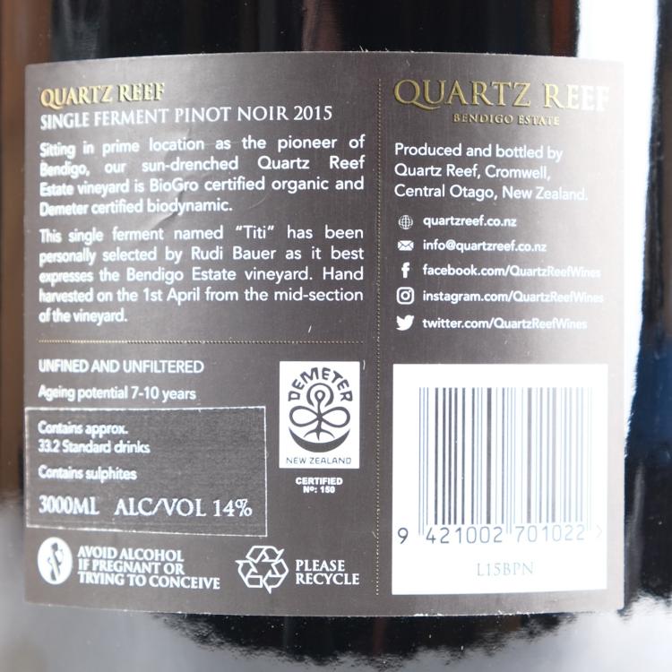 Lot 18 of 180: (1) 2015 Quartz Reef Titi Single Ferment Pinot Noir 3000ml, Bendigo